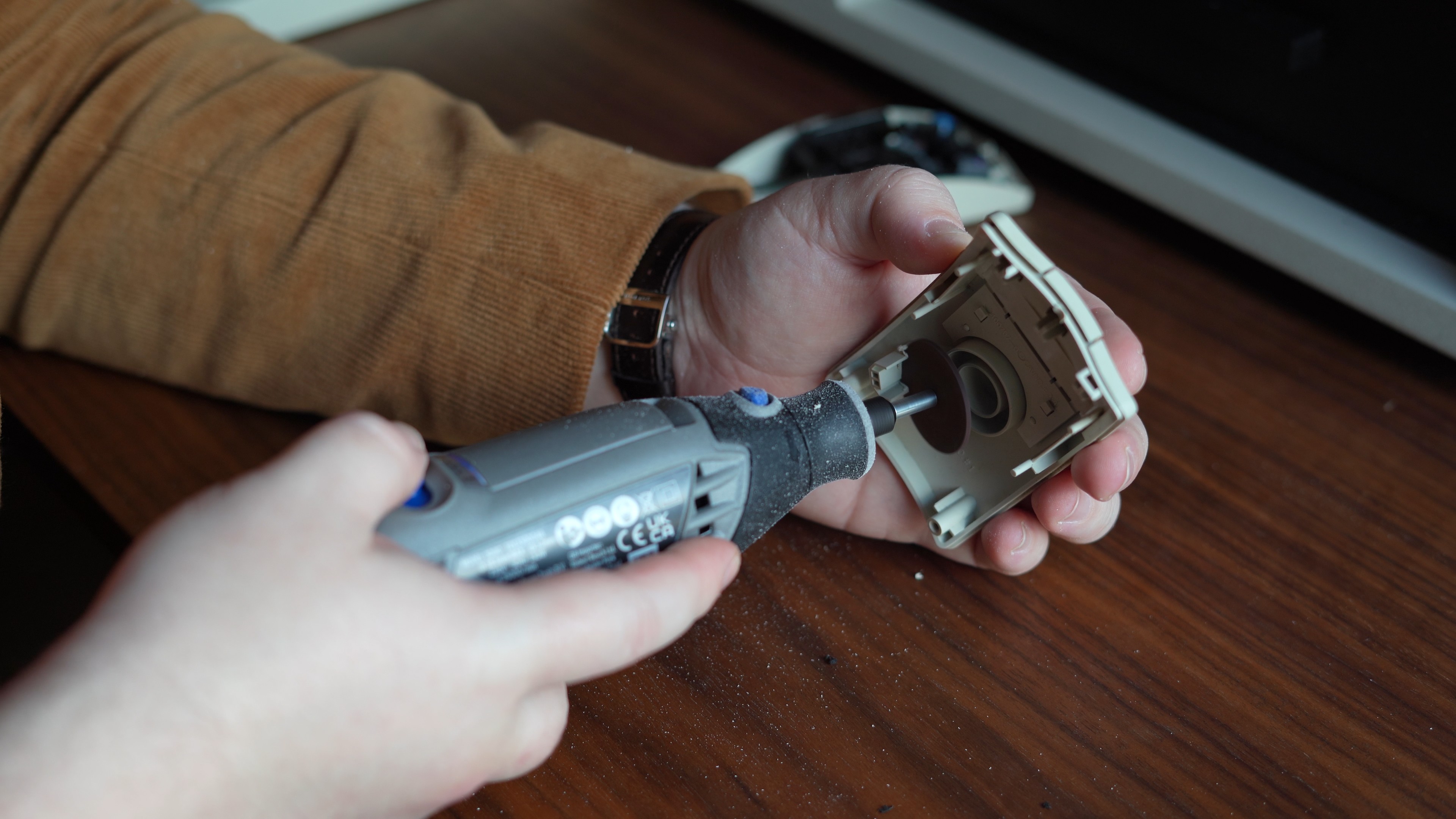 The first modification I made were to the plastic bracket holding the mouse buttons PCB this was done in order to be able to mount it to the top of the IBM mouse so that the buttons where in the right position. This was done by just gradually cutting away parts of the structure that were interfereing with the upper part of the IBM mouse. I also had to be careful when cutting some parts as the ribbon cable was connected to the side buttons that were permanently attached, I wouldn’t be using these buttons but if I damaged the ribbon cable then the mouse would no longer function.