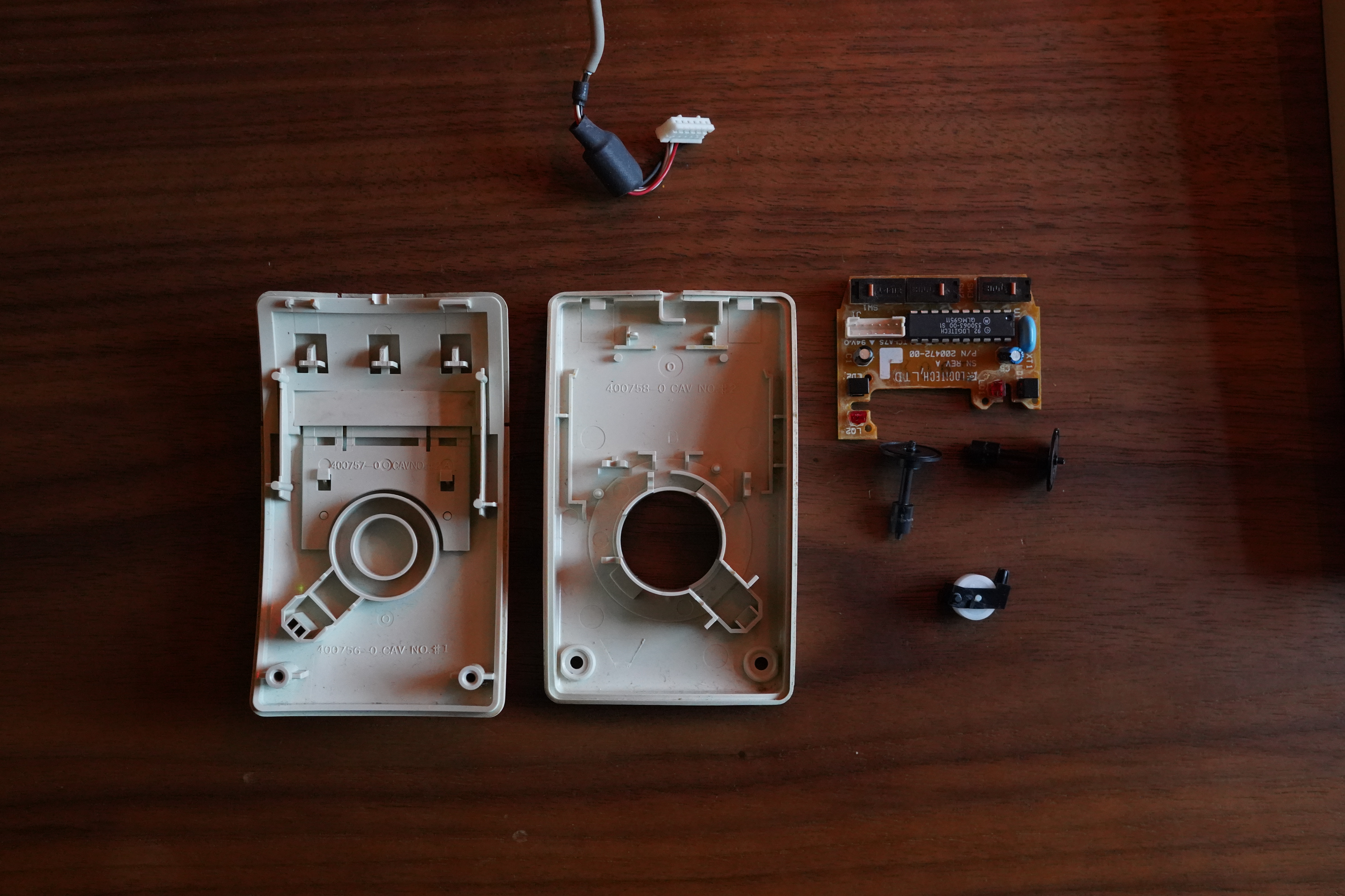 After tearing down the IBM mouse is was the turn of the Razor mouse to be disassembled. This was also pretty easy although care needed to be taken as the upper and lower portion of the mouse contain their own PCBs connected by a ribbon cable. After disassembly I was able to extract the components needed for this project, shown in Figure 7.