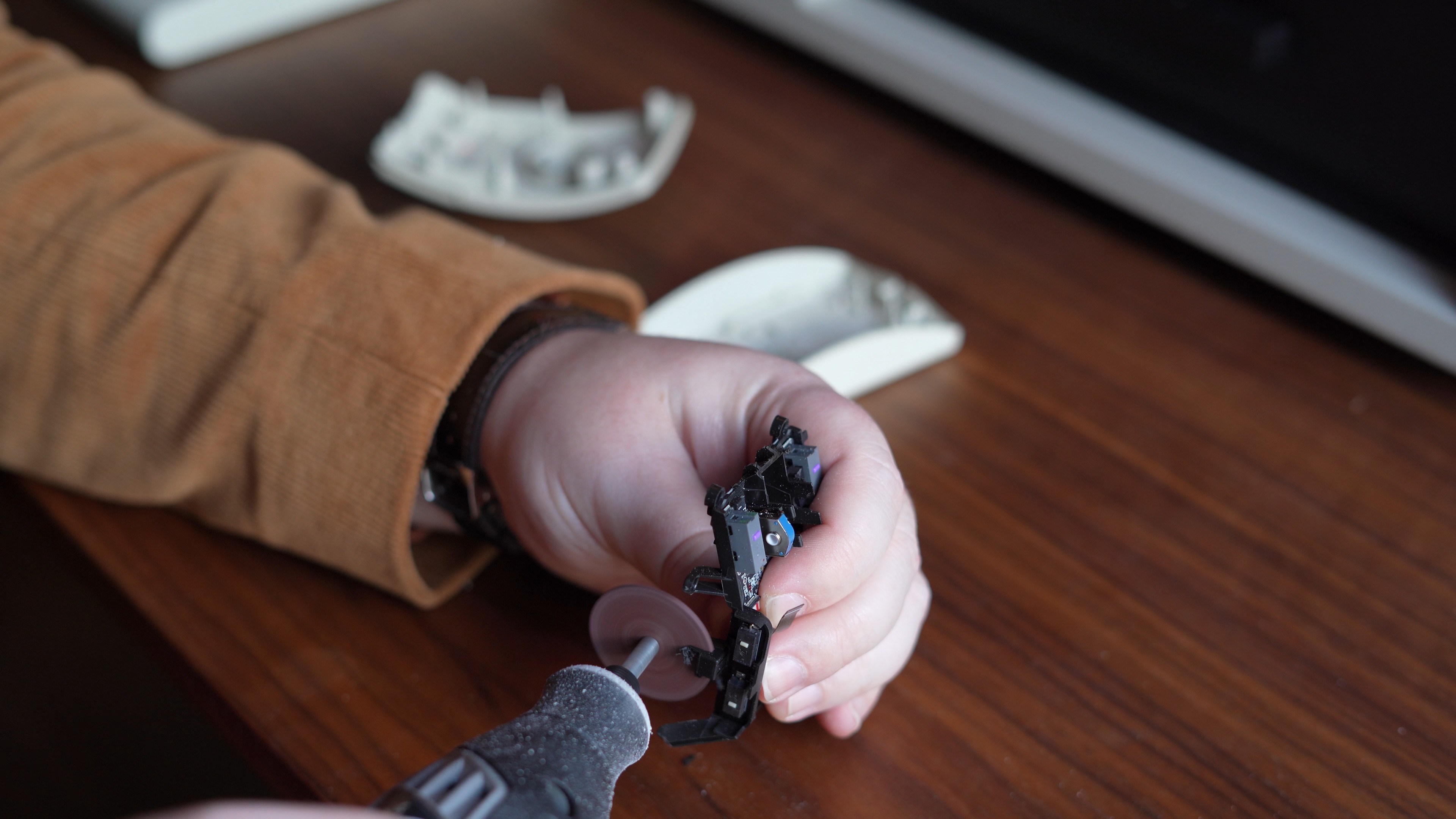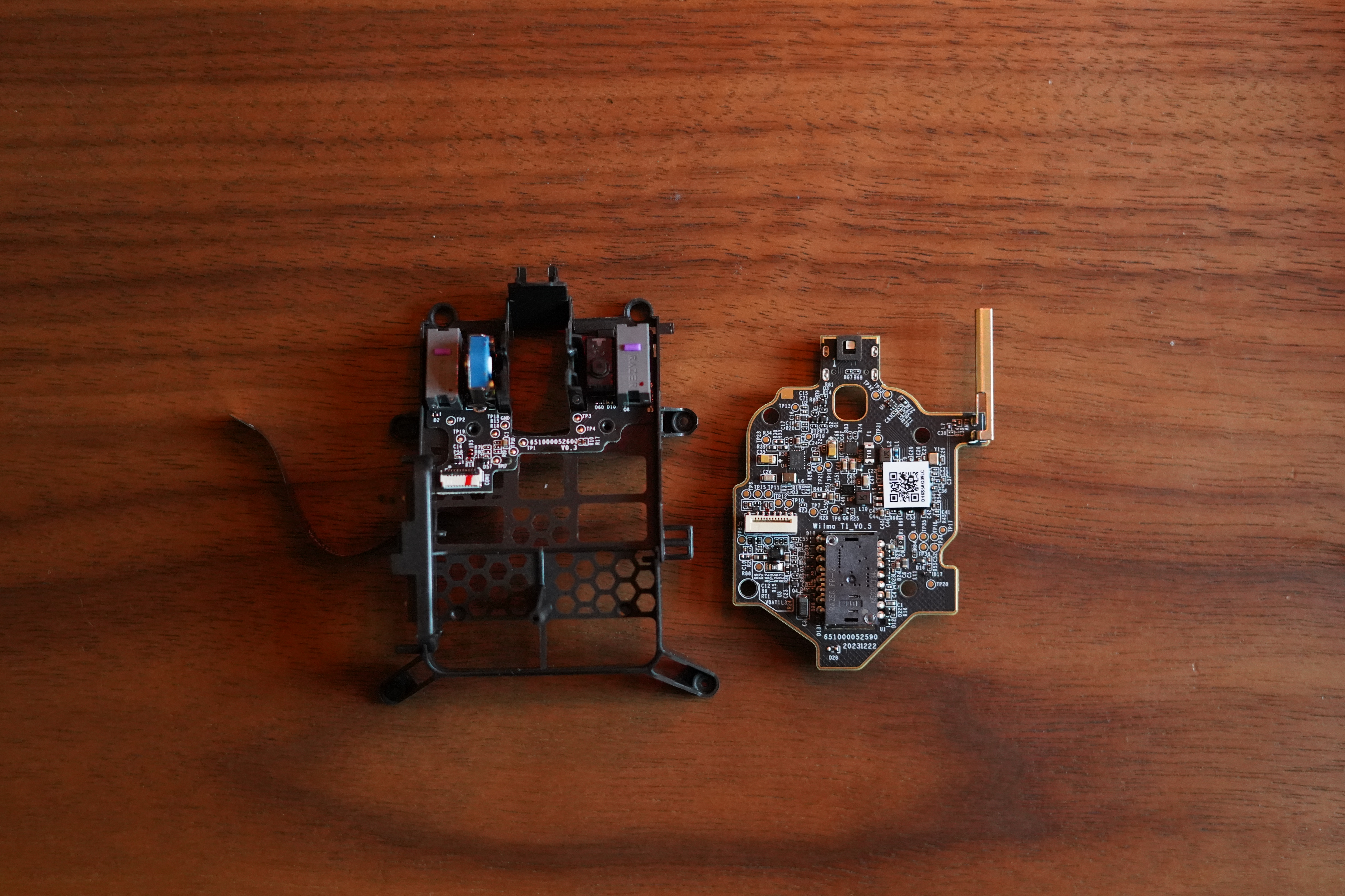 Here we just have a main board that contains the sensor, USB-C port and connector for a small lithium-ion battery and a daughter board that contains the left and right click switches the rotary encoder for the mouse wheel and another switch used for clicking down on the mouse wheel. The fact that the daughter board is mounted to a plastic frame is rather convenient as it allows me to modify it to fit the new mouse and brace itself against the bottom of the mouse.