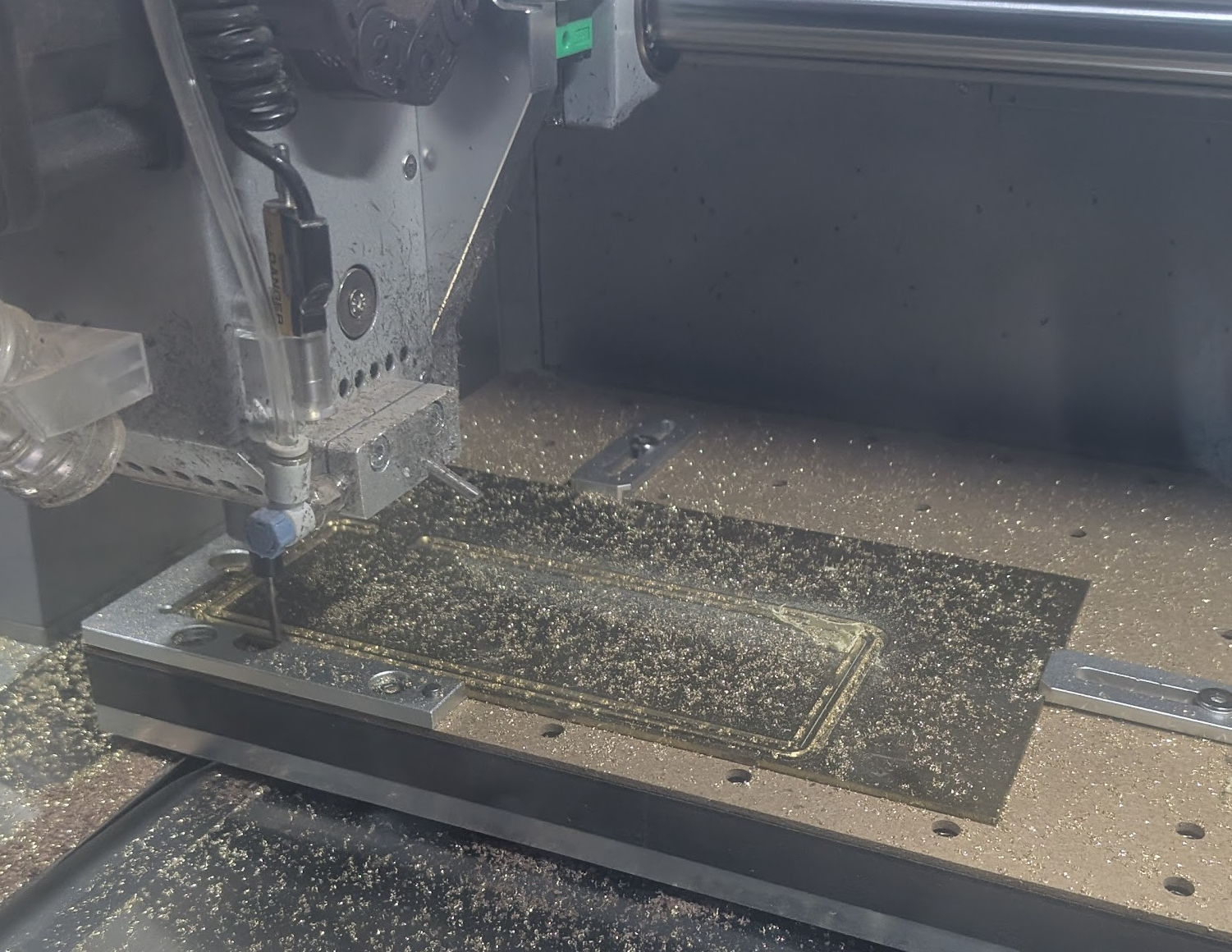 For the CNC milling there are only four main parts, top and bottom halves of the case, brass track for closing and the brass plate for the back of the case for accent and to allow engraving. However each half of the case does require two operations, one for the internal geometry and then the piece needs to be flipped and re-positioned in order to cut the external geometry, making it a bit tricky. In order to properly mill these I had to be careful about order of operations making sure it was possible for me to properly hold the pieces when cutting the reverse side.